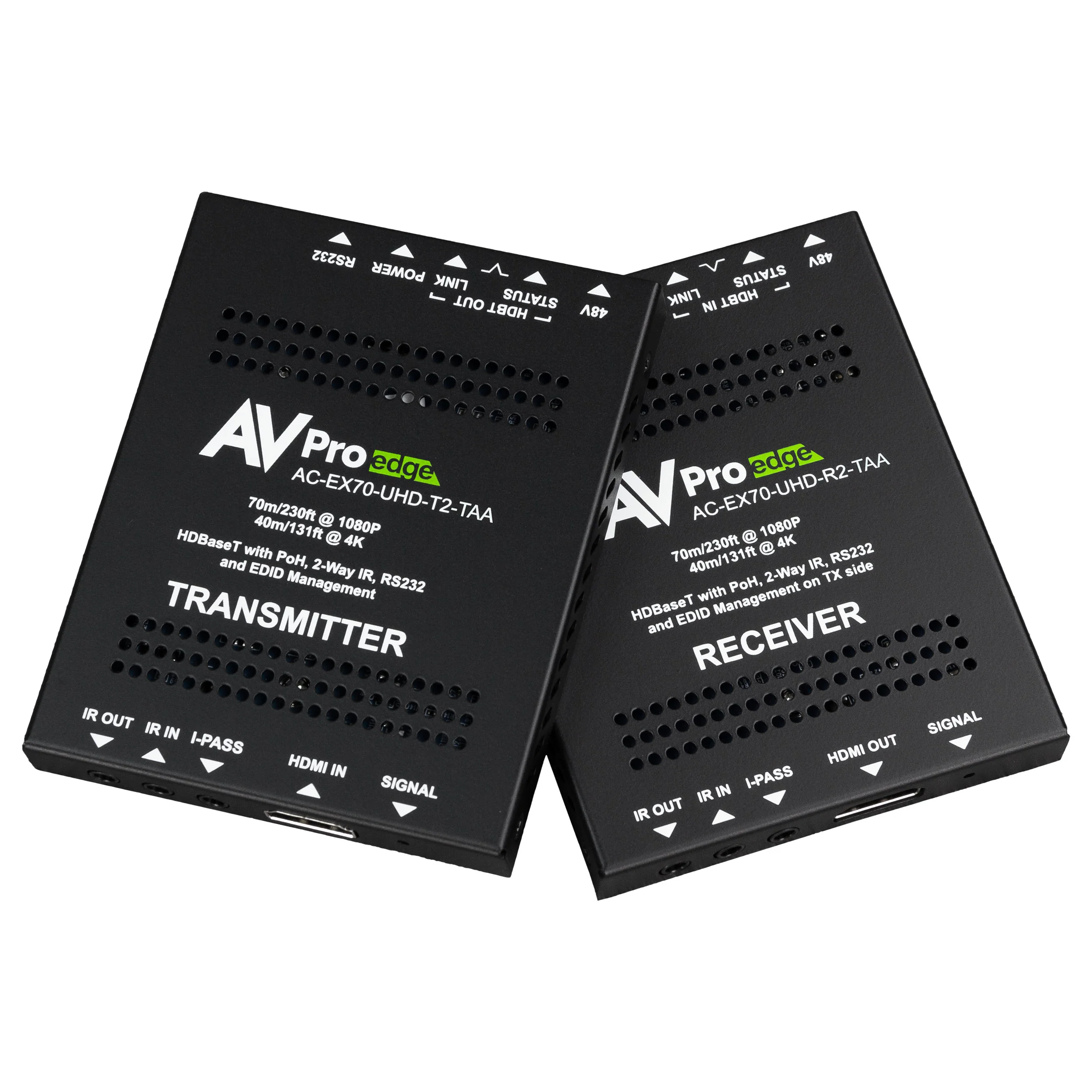 This is the TAA Compliant of the AC-EX70-UHD-KIT uses proven HDBaseT technology to reliably transport HDMI HD and UHD signals up to 70 meters over a single, twisted-pair category 5E, 6, 6A or 7 cable.